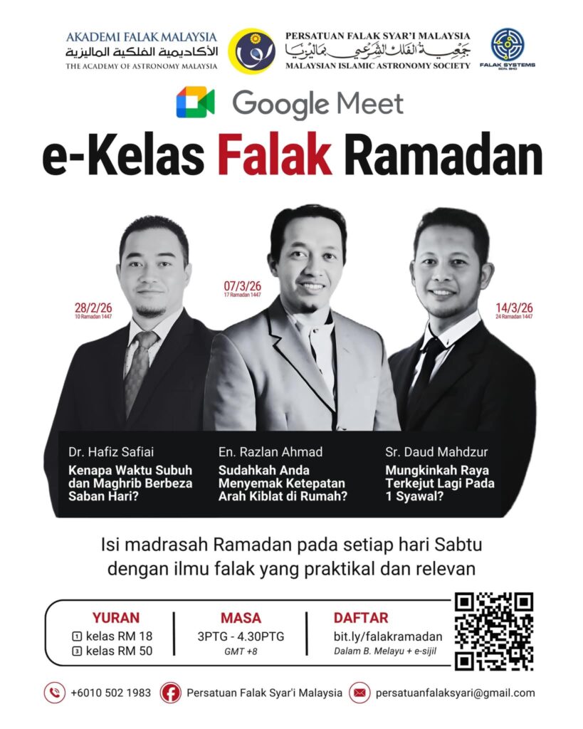 Persatuan Falak Syar’i Malaysia menyelenggarakan program e-Kelas Falak Ramadan, sebuah seri pembelajaran astronomi Islam yang dirancang khusus selama bulan Ramadan. Program ini terbuka untuk masyarakat umum yang ingin memahami dasar-dasar ilmu falak secara praktis dan mudah diterapkan dalam kehidupan sehari-hari. Seri eksklusif ini berlangsung selama tiga pekan dengan pendekatan santai, interaktif, serta berorientasi pada penerapan […]