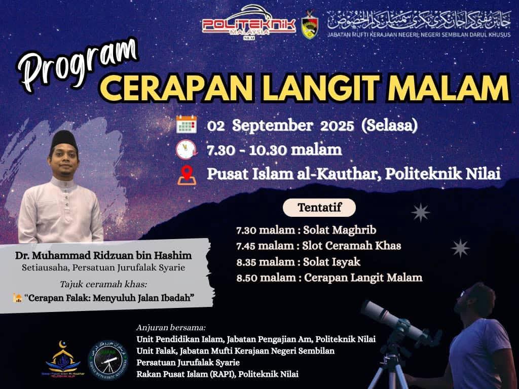 Nilai – Pusat Islam al-Kauthar Politeknik Nilai menjadi tuan rumah kegiatan Program Cerapan Langit Malam pada Selasa malam, 2 September 2025. Acara ini berlangsung mulai pukul 19.30 hingga 22.30 malam dengan melibatkan berbagai pihak, antara lain Unit Pendidikan Islam Jabatan Pengajian Am Politeknik Nilai, Unit Falak Jabatan Mufti Kerajaan Negeri Sembilan, Persatuan Jurufalak Syarie, serta