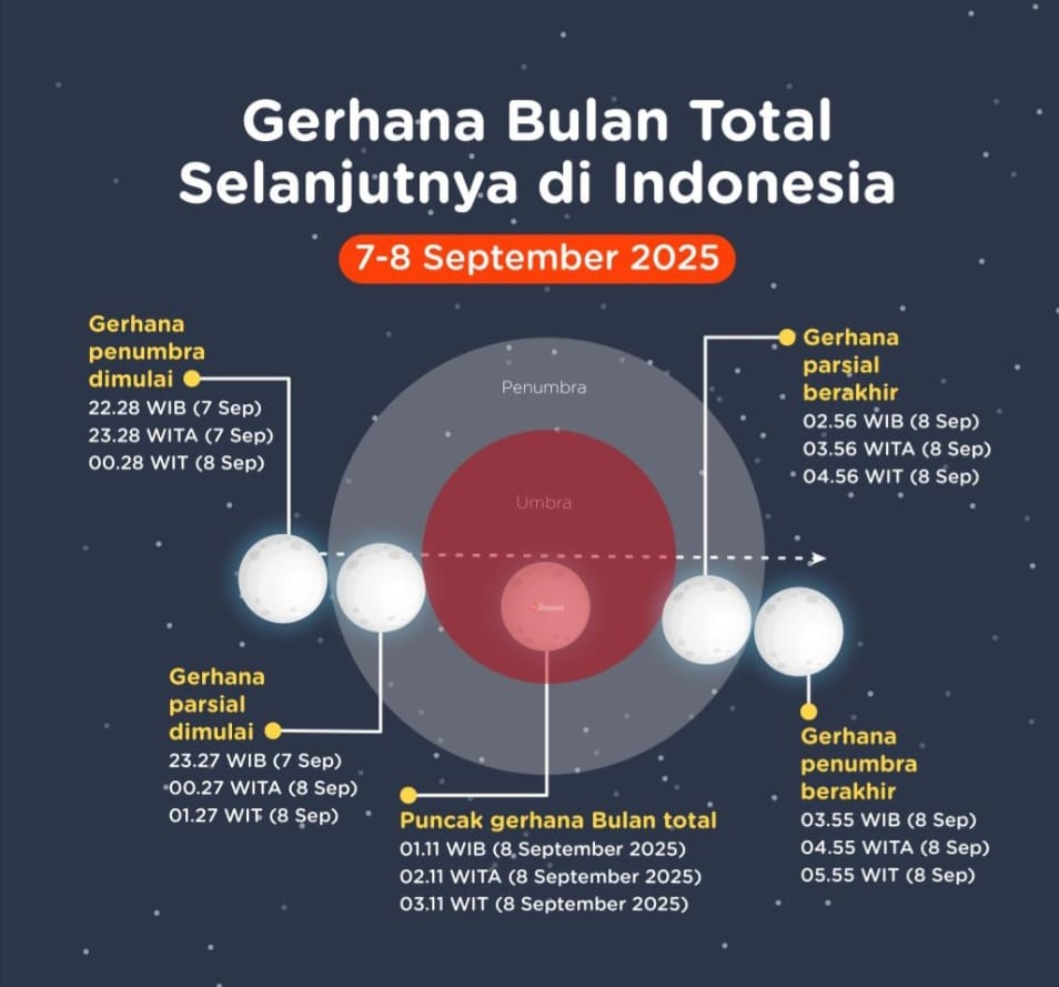 Yogyakarta – Berbagai ormas Islam, Kementerian Agama RI, Perguruan Tinggi, dan lembaga terkait mengumumkan akan terjadi fenomena alam berupa Gerhana Bulan Total pada Ahad malam hingga Senin dini hari, 7–8 September 2025, bertepatan dengan 15–16 Rabiulawal 1447 H. Peristiwa ini dapat disaksikan di seluruh wilayah Indonesia dengan rangkaian fase gerhana yang dimulai dari gerhana penumbra