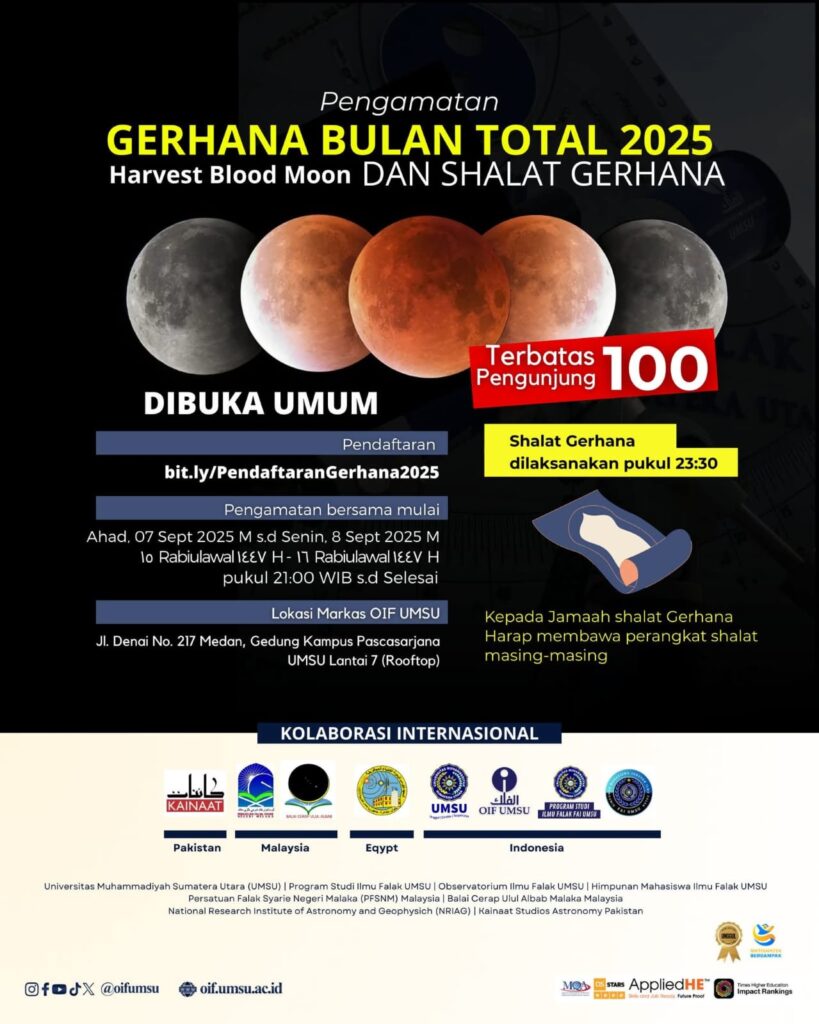 Medan- Universitas Muhammadiyah Sumatera Utara (UMSU) melalui Observatorium Ilmu Falak (OIF) kembali menghadirkan even edukasi berkelas internasional: Pengamatan Gerhana Bulan Total 2025 (Harvest Blood Moon) dan Salat Gerhana. Kegiatan terbuka umum ini dibatasi hanya untuk 100 pengunjung, dan dijadwalkan berlangsung pada Ahad malam, 7 – 8 September 2025 – bertepatan dengan 15 – 16 Rabiulawal