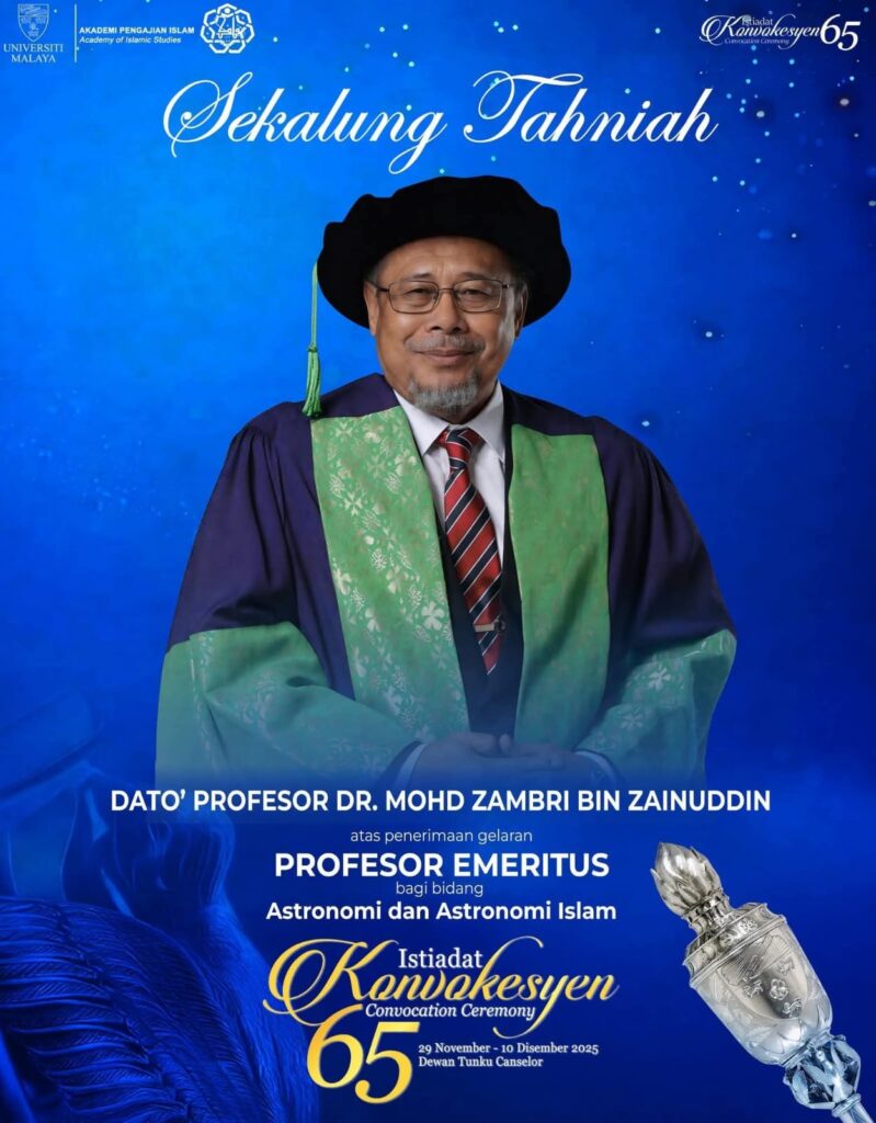 Kuala Lumpur, 8 Jumadilakhir 1447/29 November 2025 — Program Falak, Jabatan Fiqh-Usul dan Sains Gunaan, Akademi Pengajian Islam Universiti Malaya (UM), menyampaikan ucapan selamat dan penghargaan setinggi-tingginya kepada Dato’ Profesor Dr. Mohd Zambri bin Zainuddin atas penganugerahan gelar Profesor Emeritus dalam bidang Astronomi dan Astronomi Islam. Penghargaan tersebut dianugerahkan dalam rangka Sidang Konvokesyen UM ke-65, […]